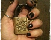 A bit of Heavy Metal for gals or guys... This antique brass Slaymaker padlock is approximately 2.75 x 2 inches(Slaymaker Arrow insignia on both sides) and has been wire wrapped with heavy guage blackened copper wire. It hangs on about 33 inches of chunky(13 x 18mm) vinta...