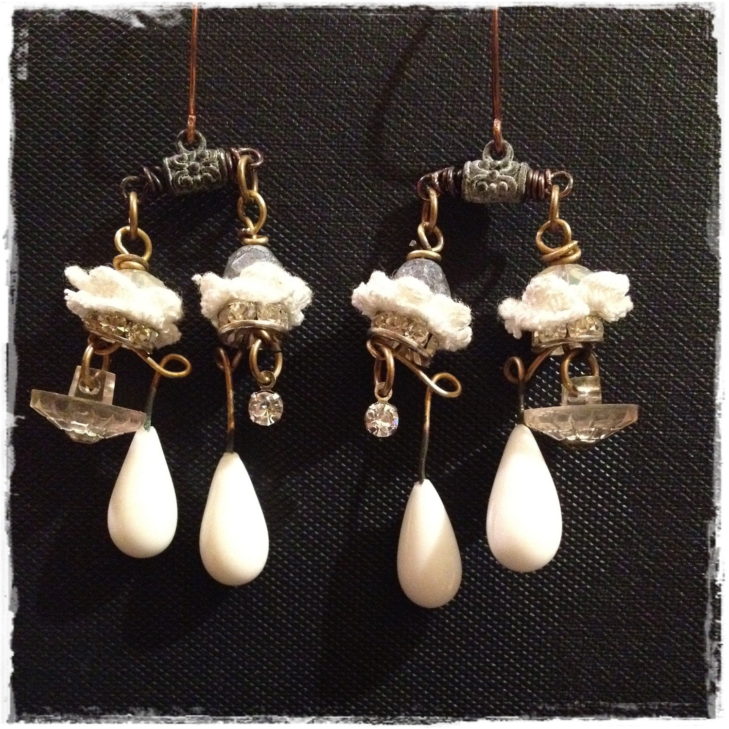 These one of a kind vintage assemblage earrings are a snowy dream. Floral crochet lace, rhinestones, wintery ...