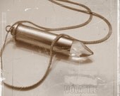 A spent silver bullet casing has been filled with antique chandelier crystal point to form this urban glam layering necklace. Hung upon18 inches vintage sterling silver snake chain, this piece is sure to make a statement with any outfit! .Closes securely with a lobster ...